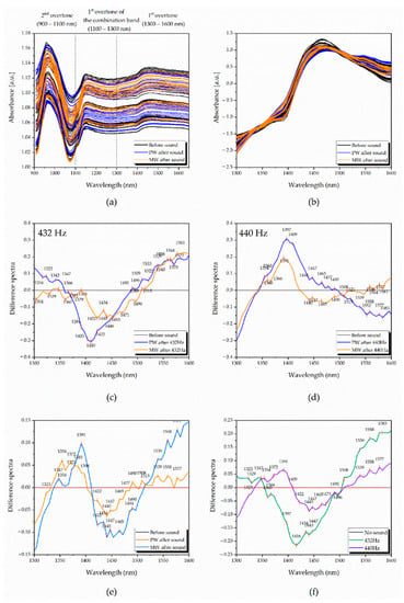 However, on closer inspection, several spectral features could be observed: large absorbance band centered around 957–963 nm corresponds to the 2nd overtone of water OH stretching vibrations, smaller band corresponding to the overtone of the combination band of free water molecules can be detected around 1143–1155 nm, and a broad peak corresponding to the 1st water overtone of water stretching vibrations can be seen located in the region 1300–1600 nm. The spectral profiles of PW show a generally higher spectral profile compared to the MW. This baseline shift is generated partially from the unfixed environmental conditions (temperature, humidity, water layer on the surface of the sample’s vials, etc.), that may influence scattering of light and lead to differences in the real pathlength of light, but the higher spectral profile of PW can also be due to the higher actual water content since MW contain lots of minerals. When applying SNV preprocessing on the raw data, the baseline effects were removed (Figure 1b). Calculating difference spectra (Figure 1c–f) yielded more information on the effects of sound. This method requires the subtraction of a sample spectrum, usually of the control group (in this case the waters before sound perturbation), from the spectra of the other samples (waters after sound perturbation). The calculated difference spectra presented in Figure 1c,d, respectively, display 432 Hz and 440 Hz datasets with averaged waters’ spectra after subtraction of averaged spectrum of the control.