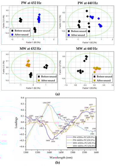 PCA scores and loadings separating samples before and after sound: (a) Scores of 1st and 2nd principal components for the 4 datasets; (b) loadings of 1st principal components for the 4 datasets, separating before from after samples (it should be noted that the sign of PC loadings is assigned arbitrarily, and due to this, the loading of PC1 for MW at 432 Hz was multiplied by −1).