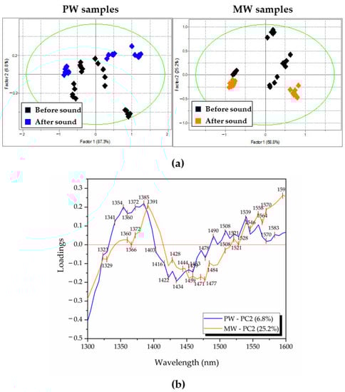 Score plots of PCA analysis of raw spectra preprocessed with SNV for separate PW and MW datasets: (a) Score plots for PW data (left) and MW (right); (b) PCA loadings describing influence of sound at PC2 for both waters (positive peaks are related to samples after sound perturbation).