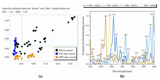 SIMCA classification of waters before and after sound perturbation: (a) Cooman’s plot with class distances between PW before sound, PW after sound, MW before sound and MW after sound; (b) discriminating powers comparison with applied feature scaling (normalized values from 0 to 1) between PW at 432 Hz, PW at 440 Hz, MW at 432 Hz and MW at 440 Hz, displaying prominent bands for distinguishing the sound states.