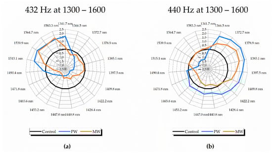 Aquagrams on waters, using prominent WABs from previous analyses, illustrating consistent WASPs at: (a) 432 Hz PW and MW at 1300–1600 nm with consistent WASP illustrated as increase in absorbance bands related to aqueous protons and strongly-bounded water; (b) 440 Hz PW and MW at 1300–1600 nm with a differently-consistent WASP characterized by higher concentration of water solvation shells, trapped and free water molecules.