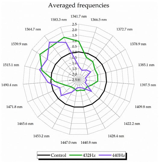 In the next step, the aquagrams were calculated with both waters’ spectra taken together to try to obtain more general water spectral patterns, irrespective of the water type, and to see what the difference between water spectral patterns is depending on the frequency of the applied sound, and what exactly sound does to water molecular structure independent of sound frequency (Figure 6). The specific WASPs for 432 Hz and 440 Hz were generated when the averaged spectra of controls were subtracted from their corresponding datasets and averaging according to the frequency was performed.