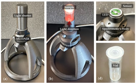 The spectrophotometer used for this study was a MicroNIR 1700-ES (Viavi Solutions, Scottsdale, AZ, USA), capable of acquiring spectra in the wavelength range of 908.1–1676.2 nm, with a wavelength step of approximately 6 nm. The device was set on reflectance mode and used with its vial-holder attachment and a 3D-printed light-shutter cap (Figure 8a). During the experiments, samples were measured before and after the played sounds, where each vial had its spectra taken 5 times consecutively and represented as 1 sample.