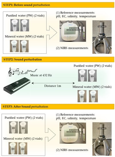The entire experimental flow is given schematically in Figure 9. Steps 1–3 were first performed for the sound perturbation using 432 Hz music, then the entire experiment was repeated, using the 440 Hz frequency.