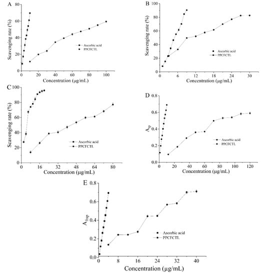 DPPH is a kind of free-radical-generating substance which is widely used to monitor the free radical scavenging properties of different antioxidants [28]. As plotted in Figure 1A, there was a positive correlation between the DPPH radical scavenging activities of PPCFCTL and ascorbic acid and the concentrations. When the concentrations of PPCFCTL and ascorbic acid were in the range of 10 to 100 and 1 to 10 µg/mL, the scavenging rates were from 11.20 ± 0.37% to 59.40 ± 1.04% and from 8.58 ± 1.54% to 69.66 ± 0.53%, and their 50% scavenging concentration (SC50) values were 74.96 and 6.74 µg/mL, respectively. According to the corresponding SC50 values, the order of the DPPH radical scavenging activities was ascorbic acid > PPCFCTL.