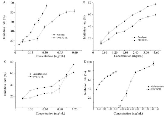 Enzyme inhibitory activities of PPCFCTL: (A) lipase inhibitory activities, (B) α-amylase inhibitory activities, (C) α-glucosidase inhibitor activities, (D) acetylcholinesterase inhibitory activities. Data represent means of three independent experiments (mean ± SD).