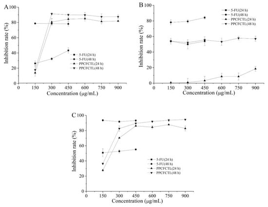 In vitro evaluation of anticancer properties using cancer cell lines is an important tool in discovering new anticancer drugs with high specificity [40]. MTT and other tetrazolium haline-based detection methods are among the most popular techniques for quantitative assessment of cell proliferation, viability, and cytotoxicity due to their low cost, high efficiency, and simplicity [41]. The typical MTT method is the colorimetric determination on a microtiter plate and the absorbance at the end of the measurement. Tetrazolium acts as an indicator of intracellular reduction potential, which in turn indicates the overall state and viability of cells. The enzymolysis of and reduction in tetrazolamide by the cell dehydrogenase and reducing agent resulted in violet blue and water-insoluble formazan products [42]. The activities of PPCFCTL on the proliferation of HeLa, HepG2, and NCI-H460 cells are illustrated in Figure 3A–C. It was obvious that PPCFCTL inhibited the proliferation of all the three cell lines in a dose-dependent manner. When the concentration increased from 150 to 900 μg/mL, the inhibition rates for 24 h of PPCFCTL treatment ranged from 13.98 ± 4.58% to 81.88 ± 1.35%, 0.66 ± 1.51% to 18.48 ± 3.18%, and 27.71 ± 1.40% to 82.77 ± 3.24%, and for 48 h ranged from 17.82 ± 5.31% to 87.54 ± 2.34%, 53.97 ± 3.70% to 57.06 ± 3.23%, and 36.39 ± 1.17% to 94.51 ± 0.41%, for the HeLa, HepG2, and NCI-H460 cells, respectively. Thus, the effect of 48 h treatment was generally better than that of 24 h treatment. The experimental results were similar to those of Chen et al. [43].