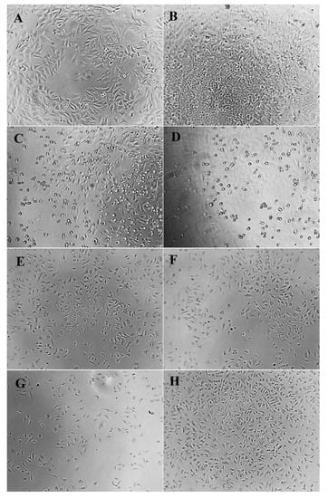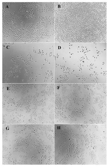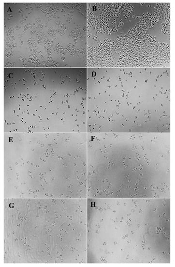 Effect of PPCFCTL on morphology of NCIH460 cells. Negative control group ((A) 24 and (B) 48 h), 150 µg/mL 5-FU treatment group ((C) 24 and (D) 48 h), 750 µg/mL PPCFCTL treatment group ((E) 24 and (F) 48 h), 900 µg/mL PPCFCTL treatment group ((G) 24 and (H) 48 h).