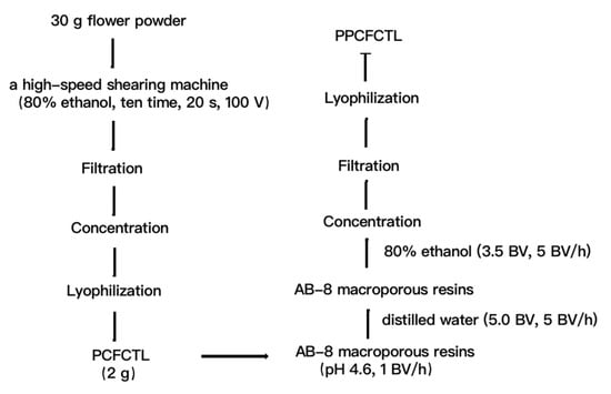 PCFCTL purification was implemented as previously reported with applicable modifications [24]. First, AB-8 macroporous resins were put into a chromatographic column (2.6 × 60 cm) using the wet method, and the final bed volume (BV) was 320 mL. Then, a dynamic adsorption test was conducted on the column. The sample solution consisted of 2 g crude extract and 500 mL deionized water, and the pH was adjusted with 1 mol/L HCl to 4.6. The solution was added to the column with a constant flow pump at a flow rate of 1 BV/h. After that, the dynamic desorption test was performed. The column was eluted with distilled water until the eluent became transparent. Later, 3.5 BV of 80% ethanol was used to rinse the column at 0.5 BV/h. Finally, the eluted solution was collected, concentrated, and lyophilized. The lyophilized product after purification is called PPCFCTL. The schematic diagram of the extraction and separation of PCFCTL from Clitoria ternatea L. is shown in Figure 7.