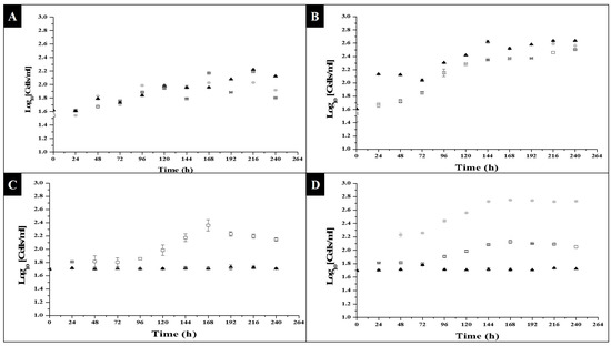 Cell growth of C. vulgaris under photoheterotrophic medium: (A) sodium acetate in 8 light hours and 16 darkness photoperiods; (B) sodium acetate in 16 light hours and 8 darkness photoperiods. □0.0005 g/L, ●0.001 g/L and ▲0.0015 g/L sodium acetate concentration; (C) glycerol in 8 light hours and 16 darkness photoperiods; (D) glycerol in 16 light hours and 8 darkness photoperiods. □0.27 g/L, ●0.33 g/L and ▲0.44 g/L glycerol concentration.
