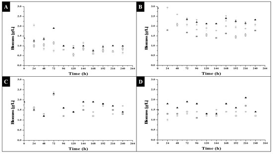 where W1 and W2 were the biomass concentration (g/L), and t1 and t2 were the time in which the change in biomass concentration, expressed in days, was evaluated. With this, the results for a photoperiod of 16 h of light and 8 h of darkness, with sodium acetate as substrate, were 0.0425 g L−1 day−1, 0.5365 g L−1 day−1 and 0.2682 g L−1 day−1. Sodium acetate, at a concentration of 0.001 g/L, was therefore the best condition for obtaining biomass. Regarding glycerol under the same photoperiod, a rate of 0.1823 g L−1 day−1 was obtained for a concentration of 0.44 g/L; for the rest of the conditions, values equal to zero or negative were obtained since, as can be seen In Figure 2, the behavior of the biomass was variable throughout the 240 h, despite the fact that the samples were homogenized manually and electrically.