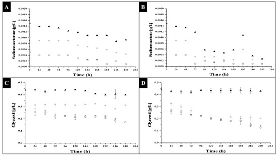Substrate consumption of C. vulgaris under photoheterotrophic growth: (A) sodium acetate in 8 light hours and 16 darkness photoperiods; (B) sodium acetate in 16 light hours and 8 darkness photoperiods. □0.0005 g/L, ●0.001 g/L and ▲0.0015 g/L sodium acetate concentration; (C) glycerol in 8 light hours and 16 darkness photoperiods; (D) glycerol in 16 light hours and 8 darkness photoperiods. □0.27 g/L, ●0.33 g/L and ▲0.44 g/L glycerol concentration.