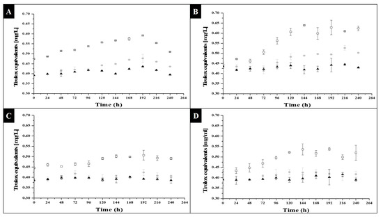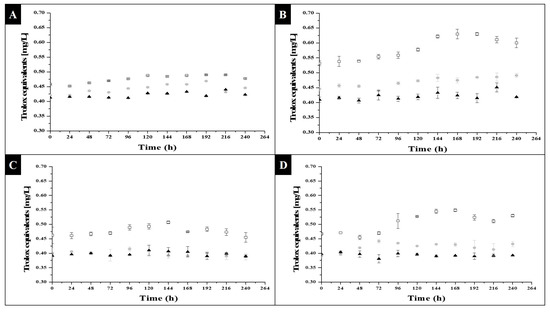 With regard to glycerol consumption, it can be seen from Figure 3C,D, that it was only in the condition of a prolonged photoperiod (Figure 3D) that a decrease in glycerol concentration occurred, and that this same behavior was reversed, in regard to the number of cells formed, in Figure 1D. Regarding Figure 3C (short photoperiod), it can be seen that in the glycerol conditions of 0.001 and 0.0015 g/L, the decreases were minimal, as there were no conditions that favored inducing metabolic activity in the microalgae, as shown in Figure 1C, and starting the consumption of substrate, so that the glycerol remained constant or had slight variations in concentration throughout the kinetics. With the above, the fact that the type of photoperiod, as well as the type of substrate, directly influenced metabolic activation for cell growth was reaffirmed.