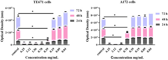 In addition, common for both cell lines is the fact that, for TE671 cells and for the concentrations ranging from 6.25–0.39 mg/mL, the degree of the cytotoxic effect of the extract was the same. For A172 cells, the same was observed for the concentrations ranging from 6.25–1.56 mg/mL. Furthermore, when cells were treated with 0.78 mg/mL and at 24 and 48 h, although the extracts’ cytotoxic activity was still evident, at the same time proliferation of cells had begun slightly. On the contrary, at 72 h of treatment, cancer-cells’ viability had not considerably increased with respect to that of 24 and 48 h.