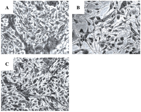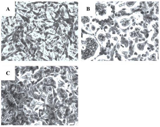 Microscopical investigation of TE671 is presented in Figure 3A–C. More precisely, in Figure 3A, cells are confluent since they have undergone any treatment, while at the concentration of 0.39 mg/mL cells are significantly reduced (Figure 3B). In Figure 3C, which corresponds to the concentration of 0.19 mg/mL, cells proliferation has begun. In the case of A172 cells, the same behavior was observed (Figure 4A–C). Figure 4A represents those cells that have received no treatment. At the concentration of 0.78 mg/mL, cells are less confluent (Figure 4B), while at the concentration of 0.39 mg/mL, proliferation of cells is evident (Figure 4C).