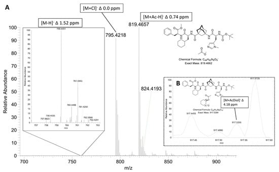 (A) Excerpt of full negative ion mode (ESI−) spectrum of tetrapeptide 1 with 1% acetic anhydride 4 and 1% acetic acid 15 sprayed from DCM. Insert of zoom on [M−H]− ion of tetrapeptide 1 (m/z = 759.4451). (B) Selected Ion Monitoring (SIM) of m/z = 917.5 of tetrapeptide 1 with acetic anhydride 3 as well as R,R-trans-cyclohexane-1,2-diol (R,R)-2 sprayed from DCM. Important ions are annotated with their respective masses and mass errors. One possible charge localization of [M+AcDiol]− is shown; others are possible.