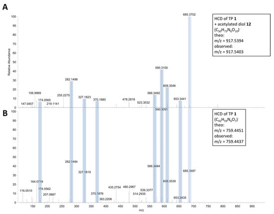 HCD of the reaction product complex with m/z = 917.53 (A) and HCD of 1 m/z = 759.44 (B) with equivalent fragment masses accentuated by light blue color. Stacked plot of negative ion mode (ESI−) spectra of tetrapeptide 1 with acetic anhydride 3 as well as R,R-trans-cyclohexane-1,2-diol (R,R)-2 (A) and 1 alone (B), sprayed from DCM.