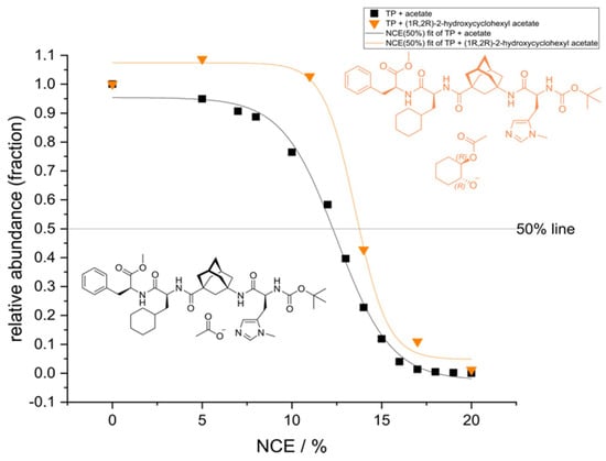 The E50 value corresponds to the normalized collision energy (NCE) needed to dissociate 50% of the complex and can be used as a measure of the relative stability of the complex [23]. For TP 1 + acetate an E50 of 12.5 NCE is obtained while for the reaction product complex an E50 of 13.5 NCE is determined. The difference of 1 NCE between the two E50 correlates with higher binding affinities between tetrapeptide 1 and acetylated diol 12 in contrast to the acetate adduct of tetrapeptide 1 [24]. Since electrostatics play a large role in the interactions between molecules in ESI-MS measurements [20], the high electron density on the oxygen-atoms of 12 or 2 allows for strong interactions with 1, e.g., through hydrogen bonding that is preserved over the measurement. We could thus theorize that the delocalized charge of the acetate ion interacts less strongly with 1. Hence, the higher binding affinity with the already acetylated product 12, supports the hypothesis that during the acetylation of the diol (R,R)-2 a complex is formed either with tetrapeptide 1 or the acetylated tetrapeptide 6 before the acyl residue is transferred onto diol (R,R)-2. Thus, the detection of the acylium ions 6, 7 and 8, as well as the complexes of the acetylated diols and tetrapeptide 1 using HRMS was successful.