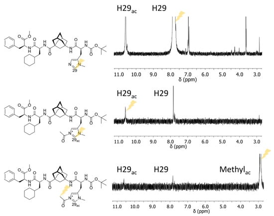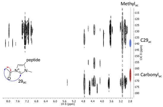 A correlation of C29ac and a 1H signal at 2.7 ppm is observed (blue). This 1H signal is attributed to the methyl protons of the acetyl fragments considering its chemical shift, as well as the other correlation the signal is showing (red). This other correlation with a 13C resonating at 165 ppm is assigned to be one with the carbonyl carbon of the acetyl fragment. These observed correlations are indicative of a covalent bond between the acetyl fragment and the imidazolium ring and thus prove the existence and successful NMR-spectroscopic characterization of acetylated tetrapeptide 6.