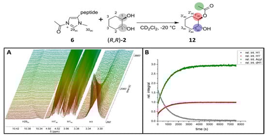 Stacked 1H−spectra excerpts (700 MHz 1H frequency) showing the course of the reaction for the selected signals H29ac, H1′ac, H1ac and H1 (A). Reaction profile of the acyl transfer from 6 onto 2 in DCM−d2 at −20 °C (B).