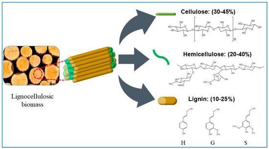 Lignocellulose biomass is an abundant, diverse, and inexpensive renewable resource in nature. It has been universally converted into biofuels, biochemicals, and biomaterials [22]. As shown in Figure 1, lignocellulose is mainly composed of cellulose (40–45%), hemicellulose (20–40%), and lignin (10–25%), which are tightly bound together to form the skeletal framework of plant. The three-dimensional network structure shows that cellulose and hemicellulose are mainly connected by hydrogen bonds, and lignin and hemicellulose are also linked with chemical bonds, such as hydrogen bonds, ionic bonds, covalent bonds, and hydrophobic interactions [23].