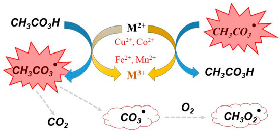To improve the oxidative ability of commercial PAA, some activators can be added to the PAA system. These activators include radiation, metal catalysts, and carbon-based materials [50,51]. For example, the O-O bond in PAA can be directly broken by UV radiation to generate the radicals R-O· and HO·, thus improving disinfection efficiency and the degradation of organic compounds [52]. UV irradiation has been used to activate PAA to form active radicals that degrade naproxen (NAP). This process would be impracticable without sufficient UV intensity, because the penetration of UV light in water is limited [50]. Hu et al. investigated an advanced oxidation technique based on UV/PAA to degrade steroid estrogens Hu, Li, Zhang, et al. [53]. The metal activators of PAA include metal ions (Cu2+, Co2+, Fe2+, and Mn2+) [54,55] and metal oxides (ZVCo, Co2O3, CoFe2O4, and Co3O4) [56]. The mechanism of PAA activation by chemical activators can be triggered through the generation of organic radicals CH3C(O)O· and CH3C(O)OO· (Figure 2); these radicals can degrade organic pollutants by advanced oxidation. Table 2 summarises the degredation of organic pollutants by chemical activation of PAA as reported in the literature.
