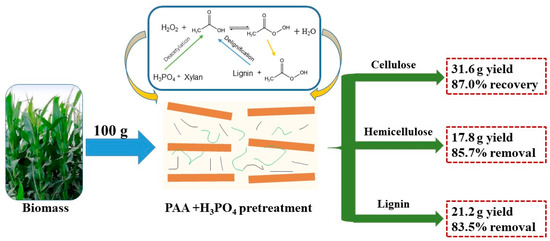- A multi-functional system in combination with PAA and other chemical or physical intensification should be established. Through the integrated PAA pretreatment system, the stubborn structure of biomass can be easily disrupted to achieve high delignification.