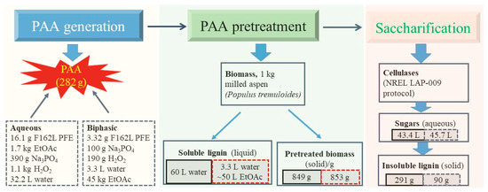 Mass balance with PAA pretreatment of milled poplar wood, including PAA formation, pretreatment and saccharification processes according to the data from reference [20].
