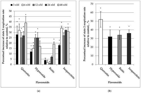 (a) Effect of flavonoids (3–48 nM) on State 2 respiration rates in kidney mitochondria. (b) Effect of flavonoids (10 µM) on State 2 respiration rate in kidney mitochondria. The mitochondrial State 2 respiration (V2) rate was recorded in medium supplemented with mitochondria and substrates (5 mM glutamate + 5 mM malate). The respiration rate of mitochondria without added flavonoids was considered as a control. The effect was calculated according to Formula (1). * Statistically significant difference (p < 0.05) compared to control (State 2 respiration rate without flavonoids).