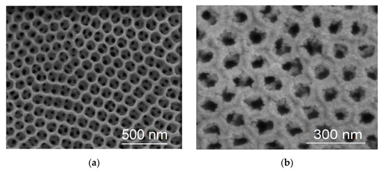 Figure 1a shows a top SEM view of a bTNT substrate prepared by anodization for 5 min (bTNT5), followed by high temperature reduction by CaH2 and annealing (for exact procedure see Section 4.1 in Materials and Methods as well as Ref. []). Nanotubes of 2.03 μm length and a ca 200 nm diameter, with a long-range open structure have been obtained; the latter is important both for platinization of the interior of the nanotubes (via unrestricted access of the chloroplatinate reactant to the interior of the structure) as well as limited CO2 clogging during their use as MOR anodes. Indeed, close inspection of Figure 1b that depicts the SEM micrograph of the platinized Pt/bTNT electrode, reveals that, apart from complete coverage of the rims of the outer surface of the nanotubes by a nodular Pt deposit, Pt is also deposited inside the pores. (Similarly prepared systems, reported in our previous work [], consist of Pt nanoparticles with an average size of 2.5 nm that tend to form aggregates with a 10–30 nm diameter). Analysis of the acid (aqua regia)-etched deposits by ICP-MS, resulted in the determination of a 19 μgPt cmgeom−2 Pt loading.