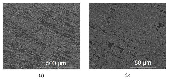 SEM micrographs of Pt/Ti foil: (a) SEI at a magnification of ×150 and (b) BEI at a magnification of ×1 k.