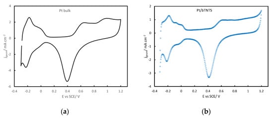 Surface electrochemistry of the Pt/bTNT5, Pt/Ti foil and Pt/Ti felt electrodes was studied by the cyclic voltammetry technique performed at a scan rate of 50 mV s−1 in a N2-deaerated 0.1 M HClO4 (70%, Merck, Darmstadt, Germany) solution between hydrogen and oxygen evolution reactions (namely −0.30–+1.20 VSCE). In addition, a bulk Pt electrode was scanned at 500 mV s−1 in the same conditions.