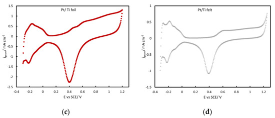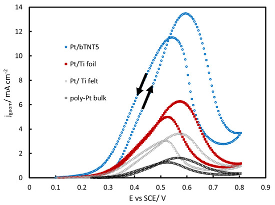 As can be seen from the cyclic voltammograms of Figure 4 below, all platinized Ti electrodes reveal features characteristic of Pt surface electrochemistry: reversible UPD-H (underpotentially deposited hydrogen) peaks in the −0.3–+ 0.1 VSCE potential range, a double layer (“flat current”) region at potentials more positive than +0.1 VSCE and the Pt oxide formation/reduction regions (as a current wave starting at ca. +0.5 VSCE and reaching a plateau during the anodic scan and a peak at ca. +0.4 VSCE during the cathodic scan respectively). Pt electroactive areas, estimated from the charge calculated by integrating the anodic peaks of UPD- desorption in the −0.3–+0.1 VSCE range (assuming 210 μC cm−2 []), were 30.51 cmPt2 cmgeom−2 for Pt/bTNT5, 14.88 cmPt2 cmgeom−2 for Pt/Ti foil, 8.95 cmPt2 cmgeom−2 for Pt/Ti felt and 5.16 cmPt2 cmgeom−2 for abraded polycrystalline bulk Pt.
