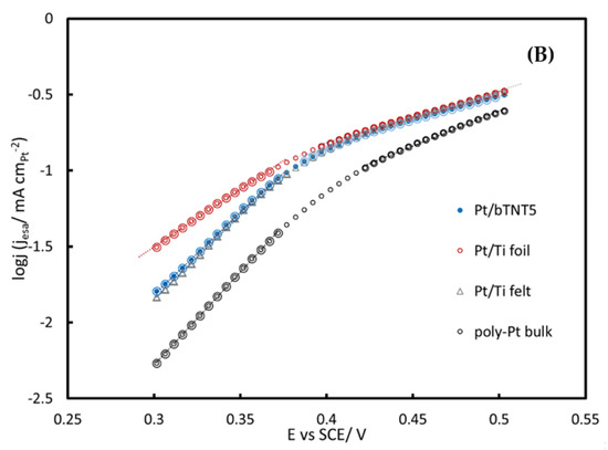 Figure 7 presents the results obtained at the platinized electrodes normalized per Pt mass i.e., providing the mass-specific currents/activities. It can be seen that the three-dimensional support of the Pt/bTNT electrode provides a very efficient substrate for Pt dispersion and hence very high Pt mass-specific activity and utilization. For the same reason the Ti felt-supported electrode is superior to the Ti foil one.