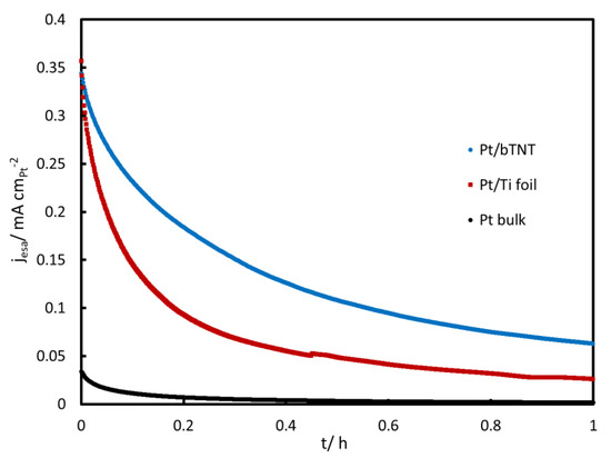 Finally, Figure 8 shows a medium-term stability test at +0.4 VSCE confirming that bulk Pt is contaminated very quickly, while the Pt/bTNT and Pt/Ti foil electrodes of a higher area and activity are contaminated more slowly than the bulk Pt electrode.