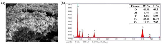 SEM image (a) and EDS spectroscopy (b) of CuFe2O4.
