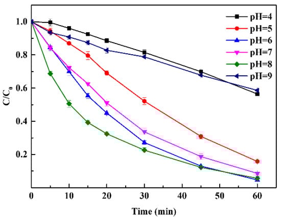In metal-based catalysis, the solution pH could affect the oxidation potential of a process, which is considered a crucial parameter for chemical oxidation reactions. The effect of initial pH on the degradation of Rhodamine B in the CuFe2O4/PAA system was further evaluated, as shown in Figure 2. Different degradation efficiencies could be observed at different pH values. At pH 4 and 9, the removal efficiencies of the system were 18.5% and 21.2% within 30 min, respectively. The sequence of degradation efficiencies under other selected pH values was as follows: pH 5 (47.9%) < pH 7 (66.4%) < pH 6 (72.8%) < pH 8 (77.5%). After 60 min of reaction, the sequence of degradation efficiencies changed to the following: pH 9 (41.4%) < pH 4 (43.6%) < pH 5 (84.3%) < pH 7 (91.4%) < pH 8 (94.4%) < pH 6 (95.4%). It can be inferred that the specific pH range (weakly acid to weakly alkaline conditions, including neutral conditions) was favorable for Rhodamine B decomposition. When the pH condition was higher than eight or lower than six, the removal efficiency decreased sharply. There were two possible causes for this phenomenon: the first was the abnormal decomposition of PAA and the second was the change of the catalyst state. For acidic conditions, it has been reported that the structure of PAA could remain stable under pH 3–5 [1]. In addition, PAA activation by Cu2+ could be suppressed under acidic conditions in AOP systems because high concentrations of H+ could inhibit the generation of CH3CO3˙ via Equation (9). Therefore, the degradation of Rhodamine B would be suppressed. Conversely, the causes changed for alkaline conditions. It has been reported in previous studies that the pKa of PAA was 8.2 [42], indicating that the self-decomposition of PAA can easily occur to produce CH3CO3− when the pH was 9 or greater. Moreover, PAA was a precursor for H2O2 according to Equation (10) [43]. Therefore, the generation of CH3CO3− and the reaction between H2O2 and CH3CO3− via Equation (11) caused the reduction of PAA, which affected the generation of radicals due to the lack of substrate activation. In terms of the catalyst, the high OH− concentration could also suppress the generation of radicals via Equation (12). Moreover, the Cu(OH)2 complex formed under alkaline conditions through the reaction between CuFe2O4 and OH− [1], which had a lower solubility and lower activity than free ions. In heterogeneous systems, these complexes are attached to the catalyst surface easily [44]. Therefore, the PAA activation efficiency was reduced by the reduction of both the catalyst and the contact area. In summary, the results showed that weakly acidic to weakly alkaline pH conditions were all suitable for PAA degradation in the CuFe2O4/PAA system. For actual sewage treatment (e.g., domestic sewage, livestock and poultry breeding wastewater, and some kinds of industrial wastewater), the CuFe2O4/PAA system holds practical value, without the need for excess acid and alkaline conditions.