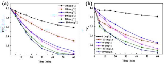 (a) Effect of PAA loading on Rhodamine B degradation (CuFe2O4 = 100 mg/L, pH = 7, C0 = 20 mg/L, room temperature for 1 h). (b) Effect of catalyst loading on Rhodamine B degradation (PAA = 80 mg/L, pH = 7, C0 = 20 mg/L, room temperature for 1 h).
