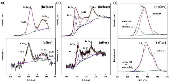 Figure 4a shows the XPS spectrum of Cu 2p before and after the reaction. The binding energy peaks at 942.70 eV and 935.30 eV could be ascribed to Cu (II). After the reaction, the two peaks shifted to 943.98 eV and 935.57 eV, respectively. A new peak at 940.97 eV was observed after the reaction, suggesting the appearance of a new valence state which could be ascribed to Cu (I) [45]. The generation of Cu (I) illustrated that Cu (II) was reduced to a +1 valence state via the catalytic process, which was similar to PMS activation and could be explained by the coexisting oxidation and reduction processes (Cu2+-Cu+-Cu2+) [14]. Figure 4b shows the XPS spectrum of Fe 2p before and after the reaction. The binding energy at 718.97 eV and 725.75 eV can be assigned to Fe2+ and Fe3+, respectively [46]. Obviously, little to no redox reactions involving Fe2+/Fe3+ occurred on the CuFe2O4 surface, which was deduced because the Fe valence state hardly changed, as indicated by the Fe 2p3/2 and Fe 2p1/2 sites after the reaction. Similar results were also reported in previous studies [29,47]. Although PAA activation has been reported in homogeneous systems via the Fe2+/Fe3+ redox cycle, iron ions exhibited lower activity than copper ions. In heterogeneous systems, the contribution of the Fe2+/Fe3+ redox cycle was limited to the catalyst surface at neutral pH conditions [29]. The O 1s XPS spectrum shown in Figure 4c illustrates two major peaks at 530.38 eV and 531.54 eV before the reaction. These peaks were assigned to the lattice O and surface adsorbed oxygen (or surface hydroxyl species), respectively [48,49]. The proportions of lattice O and adsorbed oxygen (or surface hydroxyl species) before the reaction were 6.7% and 93.3%, respectively, while lattice O nearly disappeared after the reaction. It can be inferred that strong hydroxylation reactions happened on the catalyst surface during the oxidation process. The decrease of lattice oxygen was due to the reduction of Cu2+ to Cu+, and the increase of surface hydroxyl species could be attributed to the formation of Cu-OH complexes via Equations (13) and (14).