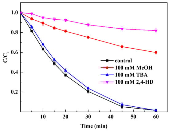 Cl− (0–200 mmol·L−1), HCO3− (0–1 mmol·L−1), and humic acid (HA, 0–5 mg/L) were added at the beginning of the reaction to evaluate the effect of water matrices on the degradation of Rhodamine B. The same reaction procedures were repeated with tertbutyl alcohol (TBA, 100 mmol·L−1), methanol (MeOH, 100 mmol·L−1), and 2,4-HD (100 mmol·L−1) added at the beginning of the reaction to assess the presence of radical species.