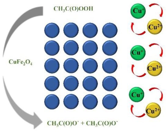 Based on the above discussion, a possible activation mechanism in CuFe2O4/PAA was proposed in Figure 6. The degradation of Rhodamine B was attributed to R-O˙ in the heterogeneous process. During the preliminary stage, ≡Cu2+ accepted an electron from PAA and was converted to ≡Cu+ which caused the subsequent generation of CH3C(O)OO˙. The generated ≡Cu+ donated an electron to PAA, resulting in the formation of CH3C(O)O˙ and the maintenance of the ≡Cu2+/ ≡Cu+ redox cycle on the surface of the catalyst.