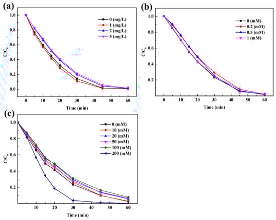 Effect of water matrices. (a) HA. (b) HCO3−. (c) Cl− (PAA = 80 mg/L, CuFe2O4 = 100 mg/L, pH = 7, C0 = 20 mg/L, room temperature for 1 h).
