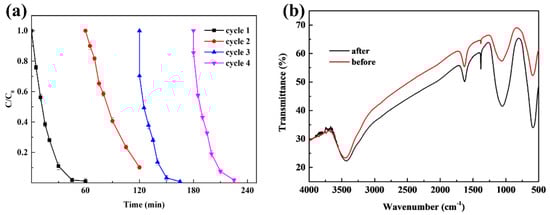In terms of practical application, reusability and stability are very important characteristics of a catalyst. To evaluate the reusability of CuFe2O4, the removal of Rhodamine B by recycling the catalyst after the reaction concluded was conducted under the same experimental conditions (CuFe2O4 dosage of 100 mg/L, PAA dosage of 80 mg/L, initial pH of 7, and treatment time of 60 min) for four cycles, as shown in Figure 8a. The final removal efficiencies were 98.9%, 89.8%, 99.2%, and 98.2%, respectively, for the four iterative catalyst recycling experiments. It was obvious that CuFe2O4 demonstrated excellent catalytic performance, and the catalyst maintained a high performance for Rhodamine B decomposition after the fourth iteration of catalyst recycling. Only a 0.7% degradation efficiency decrease was observed, suggesting that CuFe2O4 possessed high reusability towards PAA activation. In addition, The FTIR spectra of the catalysts before and after the reaction are shown in Figure 8b. No additional functional group characteristic peaks were observed for the recycled CuFe2O4, illustrating that no passivation occurred on the CuFe2O4 surface compared with the fresh catalyst, and the catalyst exhibited good catalytic stability. These results suggested that the use of CuFe2O4 could be operated within a controllable cost window, owing to the high reusability and recyclability of the catalyst.