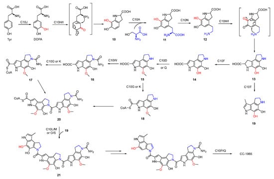 The benzodipyrrole scaffold in CC-1065 was derived from serine, methionine, and tyrosine-derived DOPA, and was revealed by isotopic feeding experiments (Figure 3) [30,31]. Wu et al. proposed the possible biosynthetic pathway of CC-1065. Tyrosine was first oxidized to DOPA which underwent intramolecular cyclization to afford 10. Next, 11 produced by the combination of serine and 10 was decarboxylated and cyclized to yield 13 which was further modified to form three different types of building blocks (17, 18, and 19). The assembly of these building blocks generated the final core structure 21 (Figure 4).