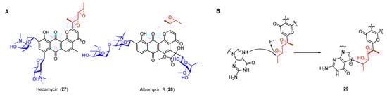 As an important family of NPs, type II polyketides display various structurally diverse biological activities [35,36]. Anthracycline compounds such as daunomycin and nogalamycin exhibit antitumor activities by intercalating into grooves of DNA, while most of these compounds are unable to form a covalent bond with duplex DNA [37,38]. Nevertheless, pluramycin antibiotics including hedamycin (27) and altromycin B (28) (Figure 6A), which usually contain an epoxide moiety, can intercalate and alkylate DNA simultaneously. Similar to daunomycin, their anthraquinone ring was characterized as intercalating into DNA and binding saccharides in the minor or major groove, thereby contributing to the stabilization of the drug–DNA complex [39,40,41]. Furthermore, their epoxides could be opened via nucleophilic attack of N-7 of guanine, resulting in the formation of an adduct by covalent bond (Figure 6B).