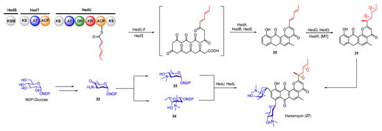 Biosynthetically, the epoxides in hedamycin were formed on its non-acetyl starter unit generated by two separate type I polyketide synthases (PKSs, HedT, and HedU). HedU was proposed to catalyze two rounds of chain elongation employing the acetyl starter unit provided by HedT (Figure 7) [42,43,44]. The obtained unsaturated 2,4-hexadienyl unit was then transferred to the downstream type II PKS to produce the aromatic precursor. The following oxidation of the C2-alkyl side in intermediate 30 afforded the epoxide intermediate 31 which was further modified by methyltransferase and two C-glycosyltransferases to yield hedamycin (Figure 7).