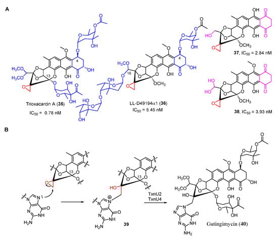 Trioxacarcins (TXNs), firstly isolated from Streptomyces bottropensis NRRL 12051 in 1981, exhibit extraordinary antibacterial, antimalarial, and antitumor activities [45]. Among the TXNs, TXN A (35) showed the most potent antitumor activities with sub-nanomolar IC50 values against various cancer cell lines (Figure 8A). The unique fused spiro-epoxide of TXN A is essential for its bioactivities because the epoxide can react with N-7 of guanine to form a DNA–TXN A complex (Figure 8B). The crystal structure of this complex revealed that glycosyl groups at C-4 and C-13 were docked with the minor and major groove, respectively [46]. It also displayed an unexpected flipping out of the base at the intercalation site, which might be important for DNA–protein interaction. Recently, the study of the TXN analog LL-D49194α1 (36) showed that the deglycosylated compounds (37 and 38) exhibited more potent anticancer activities than 36, possibly suggesting a new mode of interaction with DNA (Figure 8A) [47]. Furthermore, the DNA–TXN complex (39) could be cleaved to yield gutingimycin (40) involving a self-resistance mechanism of an excising base (Figure 8B) [48,49]. Recently, four DNA glycosylases, TxnU2, TxnU4, LldU1, and LldU5, were reported to be responsible for excising the intercalated guanine adducts [50].