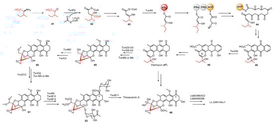 Based on the work of Zhang et al., TXNs were also biosynthesized from anthraquinone-intermediate parimycin (47), similarly to the precursor of hedamycin, as revealed by gene-deletion experiments [45]. According to isotope-labelled precursor feeding experiments, the unusual starter unit 2-methylbutyryl of TXNs was derived from L-isoleucine through transamination. After a series of modifications, including condensation with acetyl-CoA and decarboxylation, this starter unit was incorporated into the polyketide chain in virtue of KSIII (Figure 9). The formation and subsequent cyclization of the polyketide chain provided intermediate 46, whose pyrone ring was formed by a CalC-like protein, TxnO9 [51]. The decarboxylated intermediate 47 underwent complex tailoring steps to afford intermediate 51 with a unique spiro-epoxide structure, but the specific enzymatic process and mechanism remained uncharacterized. Following that, the methylation of 51 at C-4 and C-13 yielded 52, whose C4-sugar was finally acetylated by the membrane-bound O-acetyltransferase TxnB11 to form 35 (Figure 9) [52]. Unlike TXNs, the C-16 and C-4 of 45 were glycosylated and methylated to produce LL-D49194α1.
