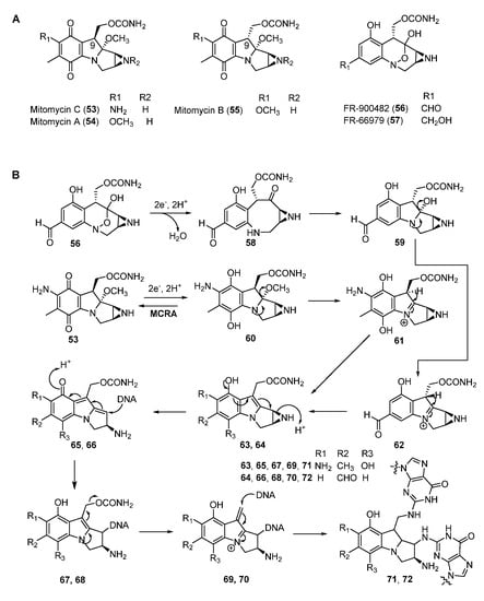 The mode of action of MMs is well studied. Firstly, a reductive pathway is required to activate the quinone moiety of MMC by either enzymatic or chemical means to form the hydroquinone intermediate 60 [18,53]. Subsequent elimination of methanol in 60 affords 61 which undergoes tautomerization and the ring-open reaction of aziridine ring to yield 65 (Figure 10B). The N-2 of guanine attacks the C-1 position to generate the DNA–compound complex, then the departure of carbamate produces the iminium intermediate 69, which is attached by the second guanine of DNA in the same way to form 71. Furthermore, the first reductive activation could be inhibited by a FAD-dependent oxidoreductase MCRA (encoded by mcrA) which enables the oxidization of the hydroquinone form to the quinone form to confer self-resistance [56,57,58,59]. Although the alkylating mechanism of FR900482 is similar to that of MMC, it is activated by cleaving the N-O bond to form 59 (Figure 10B).