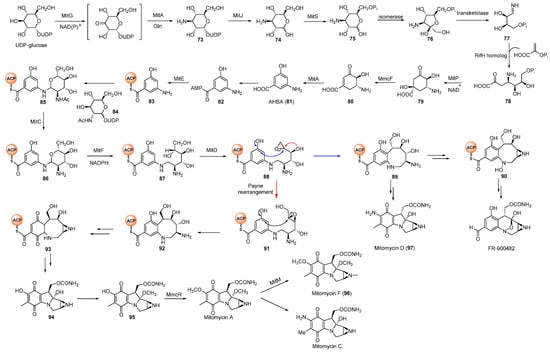 Since these compounds possess excellent bioactivities and the common pharmacophoric group azabicycle, their synthesis has attracted extensive attention. In chemical synthesis, the azabicycle moiety of MMs is installed from benzazocane intermediates via intramolecular substitution [60], but their biosynthetic pathways are still not well elucidated. According to isotopic precursors feeding experiments conducted by Hornemann et al., the origins of the O-methyl group and the carbamate were methionine and L-citrulline, respectively, while the mitosane core was derived from 3-amino-5-hydroxybenzoic acid (AHBA, 81) and glucosamine [61,62]. The precursor AHBA was formed via the amino-shikimate pathway related to rifamycin and kanosamine biosynthesis [63,64]. After the formation of AHBA, it was firstly activated by acyl AMP-ligase MitE and was then loaded onto acyl carrier protein (ACP) MmcB (Figure 11). The glycosyltransferase MitB was verified to catalyze the glycosylation of AHBA-MmcB with UDP-GlcNAc [65,66,67]. Recently, Wang et al. traced all the ACP-channelled MM intermediates indicating that AHBA-MmcB-GlcNAc intermediate 85 should undergo the deacetylation by MitC to form 86 which was further transformed to 88 by MitF and MitD [68]. The epoxide intermediate might be cyclized to provide benzazocine 92. 92 then underwent oxidation and several uncovered modifications to generate hydroxyquinone intermediate 95 which was methylated to afford MMA, the direct precursor of MMC [69]. Sherman and co-workers also identified a methyltransferase MitM which methylated the nitrogen of aziridine in MMA rather than MMC to yield MMF (96) [70]. In addition, the epoxide of 88 could be opened by the nucleophilic attack to afford 89 which was the precursor of the MMs with α-C9. Moreover, the oxidation of the aniline amine in 89 facilitated forming the core structure of FR900482.